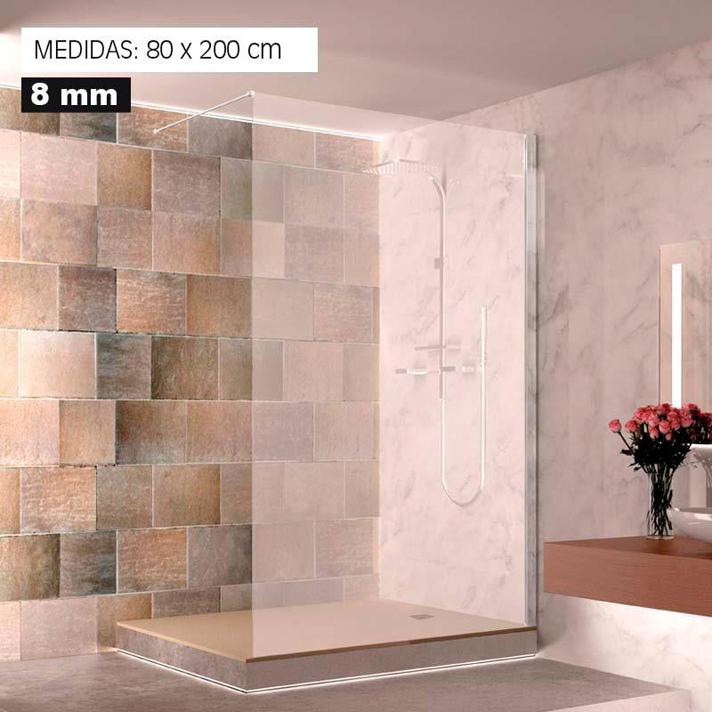 Mampara ducha frontal. Medidas: 800x1950 mm. Ancho: 785 a 800 mm. Marco de aluminio. 1 Hoja de 800 mm. Vidrio de 6 mm. Barra sujeción pared 1 metro.