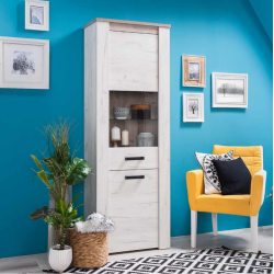 www.comercialguayarmina.com Este mueble de entrega en kit, incluye instrucciones de montaje y herraje necesario. Vitrina 2 puertas + 2 cajones colección NEVADA. Fabricada en madera de pino 100% maciza con acabado blanco.