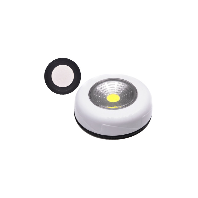 Luz led redonda, dispositivo que proporciona luz mediante un sistema de alimentación por baterías a pilas AAA (pilas incluidas). Luz pulsador para armarios, cajones, inalámbrico, Linterna pulsador led cob. superbrillo 80 LUMEN. Con adhesivo parte posterior (15 x 15 mm.)