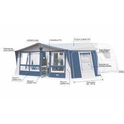 Avance práctico y flexible para caravana. Compuesto íntegramente en material poliéster PVC de larga duración. Gran resistencia a la intemperie y gran facilidad de limpieza. Tapas oscurecedoras en todas las ventanas. Frontal dividible en paneles desmontables. Ventanas laterales abatibles. Laterales desmontables y con mosquiteras. Faldones dobles....