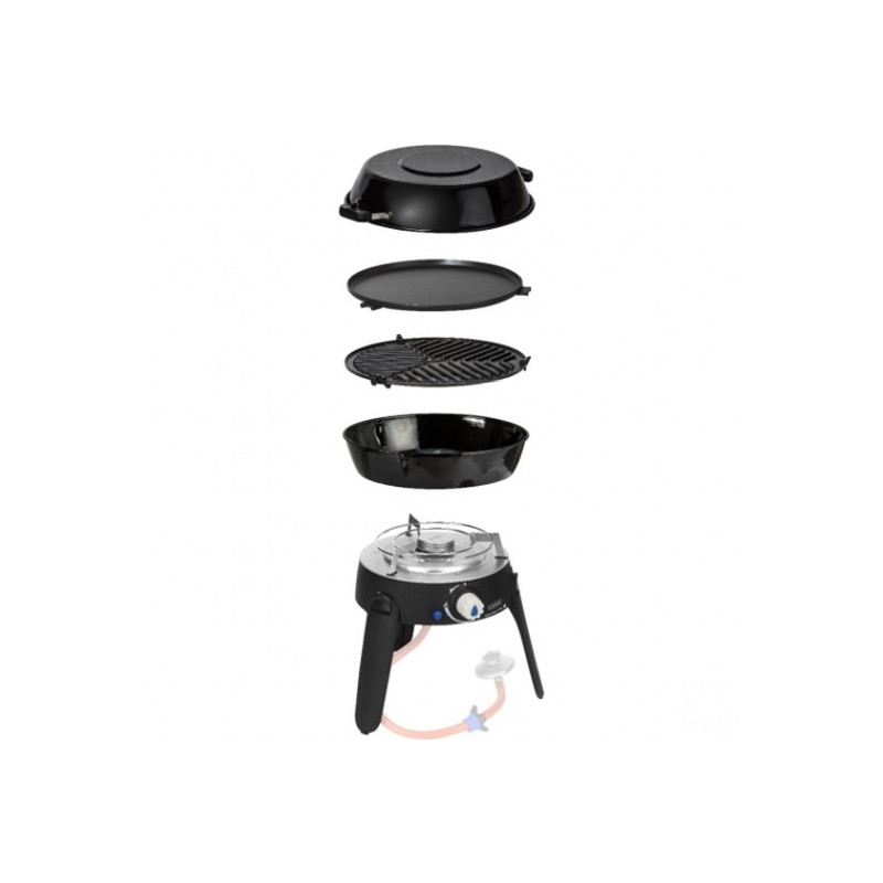 Parrilla y cocina portátil de confort con conexión para botella de gas. Válida como barbacoa, cocina, plancha y horno. Tapa con orificios de ventilación y termómetro. Sartén wok. Con encendido piezoeléctrico individual.