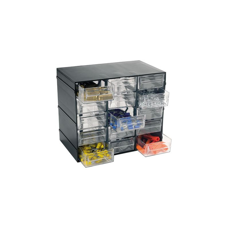 • Este completo sistema de almacenaje está compuesto por un panel de polipropileno y 15 cubos modulares (9 cubos art.101 + 6 cubos art.102), ideal para clasificar tornillos, tacos, tuercas y todo tipo de piezas pequeñas. Con unas medidas de 323 x 180 x 385 mm, se adapta fácilmente a cualquier pared de taller, almacén o zona de bricolaje. • Incluye 15...