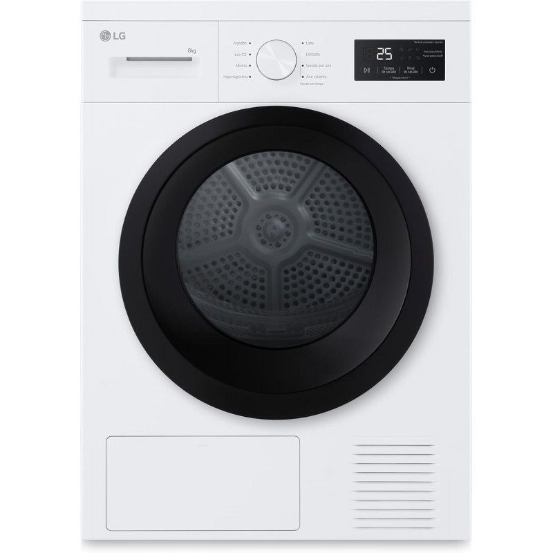 Secadora de Condensación Tecnología Bomba de Calor Capacidad de carga 8 kg Clasificación energética B 15 Programas de secado Control electrónico Programas rápidos Sensor drying technology Sensor de secado Sistema detección fallos Bloqueo niños Indicador ciclo secado Delay time Indicador limpiado filtro Indicador tanque agua lleno Luz interior Nivel...