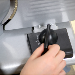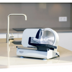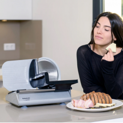 La mesa de corte abatible permite limpiar de manera rápida y sencilla, manteniendo el cortafiambres en óptimas condiciones.