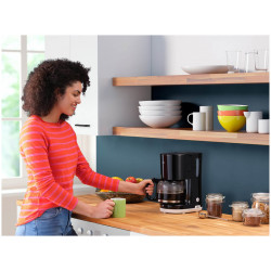Cafetera de goteo en color crema de diseño retro y funcionalidad con 1.000 W de potencia y capacidad para 12 tazas. Jarra de cristal graduada, filtro reutilizable y lavable, sistema antigoteo, placa calefactora para mantener el café caliente, depósito de agua visible y función de autoapagado.