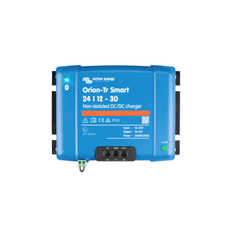 Cargador de CC/CC no aislado de Victron Orion-TR Smart 12/12-30 (360W) con Bluetooth integrado. Para su uso en sistemas de batería en vehículos o embarcaciones en los que el alternador y la batería de arranque se utilizan para cargar la batería de servicio.