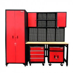 • Armario modular para taller. • Amplio armario vertical con doble puerta. • Armarios inferiores con ruedas. • Un armario bajo con cajones dónde poder guardar múltitud de herramientas. • Un armario bajo con dos puertas + un cajón. • Dos armarios superiores de una puerta. • Encimera de madera resistente y duradera. • Panel para herramientas. • Estantes...