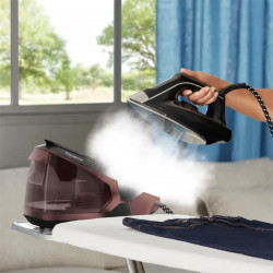 Centro de planchado de diseño ergonómico y ligero con 2.400 W de potencia, 5 bares de presión, depósito de agua desmontable de 1,5 litros, punta de precisión, suela cerámica, control de temperatura variable, función ECO, sistema antical.