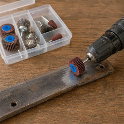 • Ideal para trabajar superficies irregulares y para la eliminación de óxido. • Incluye disco de algodón de 75 mm. • Cepillo de alambre de 75 mm. • Cepillo de alambre de 50 mm. • Cepillo de alambre de 25 mm. • Disco rejilla de 30x25 mm. • Dos cabezales de molienda. • Varilla de extensión. • Pieza de acero de 50 mm. • Piedra engrasada.