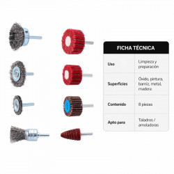 • Limpieza de superficies planas e irregulares. • Incluye: • Espigas de 1/4" (6mm). • 1 Cepillo de taza: 50mm x 1/4". • 1 Cepillo de taza: 75mm x 1/4". • 1 Cepillo de pincel: 25mm x 1/4". • 1 Cepillo circular: 25mm x 1/4". • 1 Cepillo circular: 38mm x 1/4".