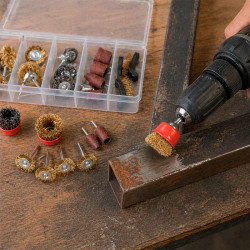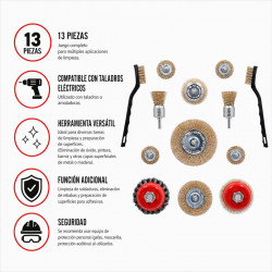 • Limpieza de superficies planas e irregulares. • Incluye: • Espigas de 1/4" (6mm). • 1 Cepillo de taza: 50mm x 1/4". • 1 Cepillo de taza: 75mm x 1/4". • 1 Cepillo de pincel: 25mm x 1/4". • 1 Cepillo circular: 25mm x 1/4". • 1 Cepillo circular: 38mm x 1/4".