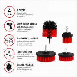 • Limpieza de superficies planas e irregulares. • Incluye: • Espigas de 1/4" (6mm). • 1 Cepillo de taza: 50mm x 1/4". • 1 Cepillo de taza: 75mm x 1/4". • 1 Cepillo de pincel: 25mm x 1/4". • 1 Cepillo circular: 25mm x 1/4". • 1 Cepillo circular: 38mm x 1/4".