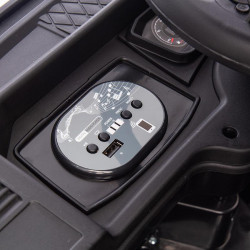 • Pedal eléctrico. • Control remoto 2.4 G. • Reproductor de música: MP3; toma USB. • Cuerpo de plástico de alto impacto y resistente a los arañazos. • Amortiguadores en las cuatro ruedas. • Motor: 2x 40W 12V 7A. • No lo use sin la supervisión de un adulto. • Medidas: 117x65x38 cm.