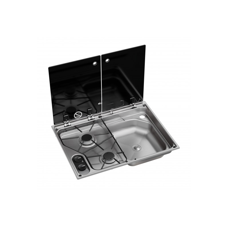 Cocina Dometic HSG3436 3xFuegos + Seno + Tapas Combinación empotrable de placa de cocción de 3 quemadores y fregadero con tapas de vidrio. 2 cubiertas de cristal de seguridad resistente al calor. Conexión para grifo de Ø 21 mm en el interior. Rejillas para artículos de cocina extraíbles y fáciles de limpiar. Soporte y tapas de los quemadores esmaltados....