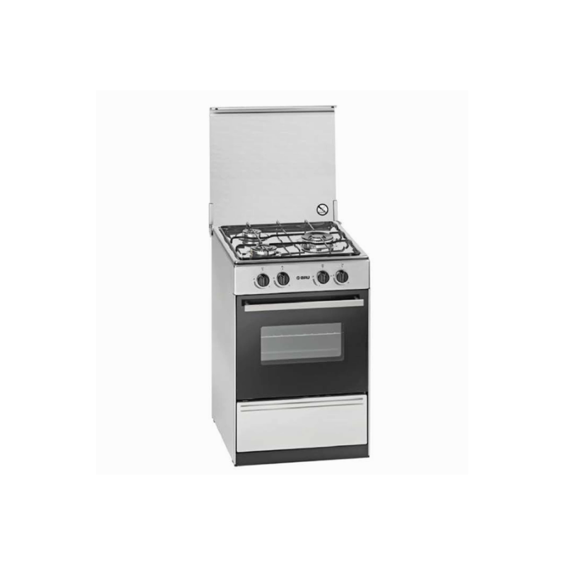 Cocina 4 fuegos a gas 1 Rápido 10cm/3000W 2 Semirápido 7.5cm/1750W 1 Auxiliar 5.5cm/1000W Controlador de llama FFD Conexión a gas butano Luz en horno Horno con válvulas de seguridad Control por termostato Bandeja y rejilla Capacidad del horno 56 L Medidas alto/ancho/fondo 850x600x600 mm Tapa metálica Color Blanco