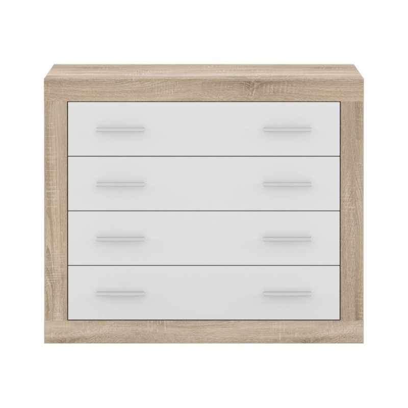 La cómoda SARA, también denominada como tocador o comodín, es un mueble especialmente pensado para guardar la ropa bien ordenada. Se trata de una cajonera de cuatro amplios cajones con estructura enmarcada en diferentes colores y con los frentes de cajón en color blanco, grafito o trufa, según la configuración que elijas. Luce igual de bien en un dormitorio de matrimonio moderno o una habitación infantil. Tu ropa siempre estará bien ordenada en la cómoda Sara. Cada uno de los cajones lleva dos tiradores en color gris para que puedas abrirla con las dos manos.