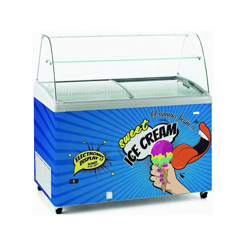 Vitrina de helados profesional Sunfeel PRO VHR151D2 con display electrónico, volumen útil 368 l, volumen bruto 474 l, rango temperatura -22ºC a -9ºC, superficie exposición 0,71 m², 4 cestos incluidos (máx. 6), tapas correderas con cierre (2 unidades), estante de cristal, diseño personalizable impresión digital, marco gris RAL 7037 injection molding, aislamiento 70 mm, controlador electrónico, ruedas, desagüe frontal, lavaporcionador, potencia 190 W, refrigerante R600a, clase energética D, consumo 2,96 kWh/24h, ruido 54 dBA, dimensiones 1280x1511x678 mm, peso neto 79 kg.