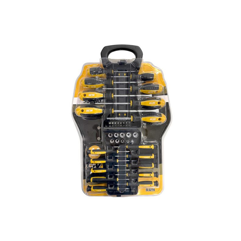• Material: CROMO - VANADIO • Mango diseño ergonómico. • Compuesto por: • 4 x Punta plana: 3, 4, 5, 6 mm. • 4 x Punta Phillips: PH1, 2xPH2, PH3 • 4 x Punta POZIDRIV: PZ1, 2XPZ2, PZ3. • 4 x Punta HEX: 3, 4, 5, 6 mm. • 7 x Punta TORX: T10, T15, T20, T25, T27, T30, T40. • 7 x Punta TORX SEGURIDAD: T10, T15, T20, T25, T27, T30,...
