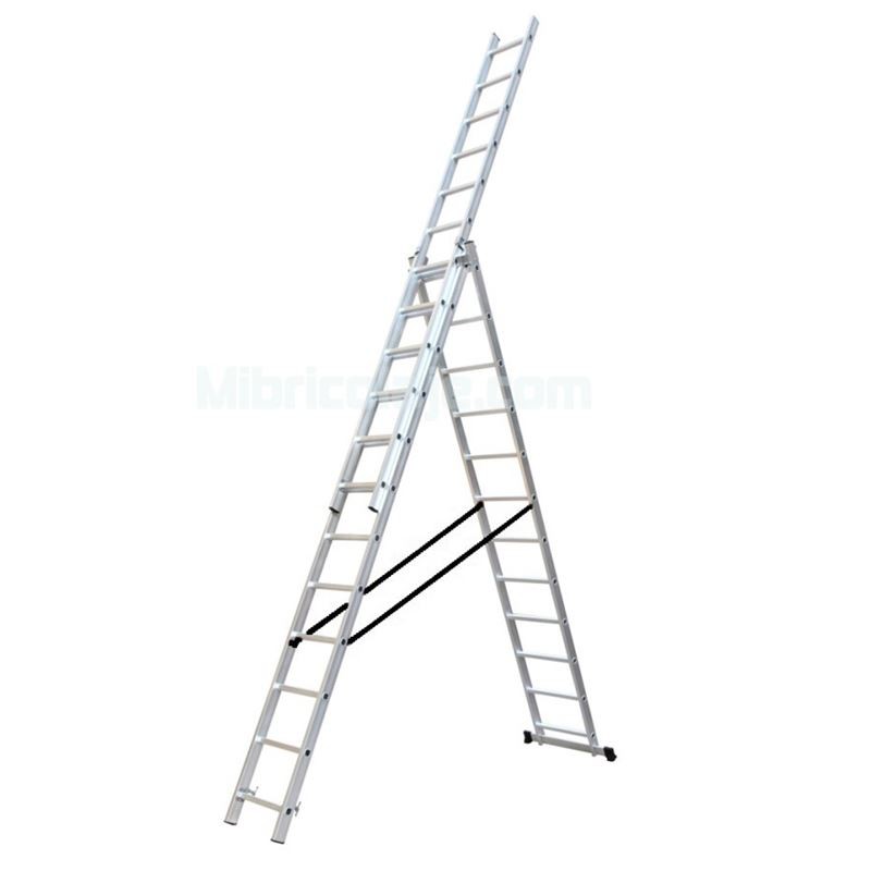 ESCALERA ALUMINIO 3 TRAMOS 3X12 AIRMEC AM120454 • 3 tramos de 12 peldaños. • Altura entre peldaño 28 cm. • Altura máxima extendida: 7.89 mts. • Altura mínima replegada: 3.41 mts. • Altura en Tijera: 3.23 mts. • Altura en Tijera + tramo extendido: 5.35 mts. • Máximo peso: 150 Kgs. • Normativa EN-131. • Peso: 18.5 Kgs