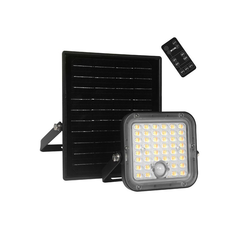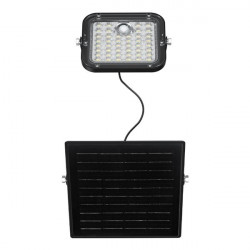 3600 Lúmenes • Luz fria: 6500K • Foco con carcasa de aluminio de alta calidad • Sensor presencia • Batería: 3.2V / 25AH • Panel Solar: 5V / 20W • Longitud del cable entre foco y panel: 1 metro