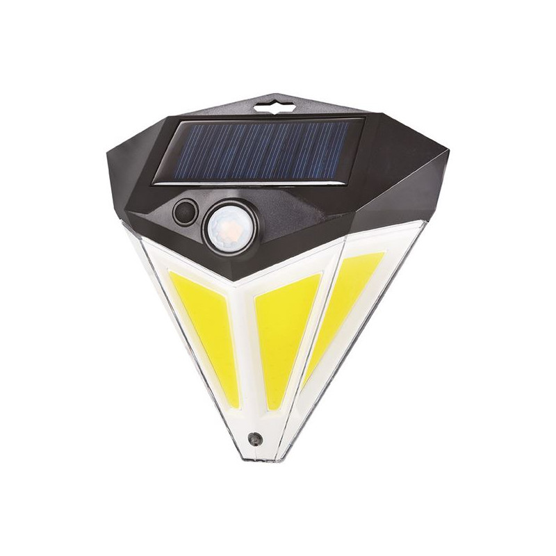 www.mipuntomovil.com • Luz solar 3.5 Watios• 450 lúmenes.• 6.500 k luz fría.• Incorpora sensor de movimiento.• Funciona con energía solar.• Máximo ahorro.• Batería: 2.000 mAh / 3.7 v.• Altura de instalación: = 4 m.• Área de detección: 120º/= 6 m.• Color: negro.• Protección IP65.