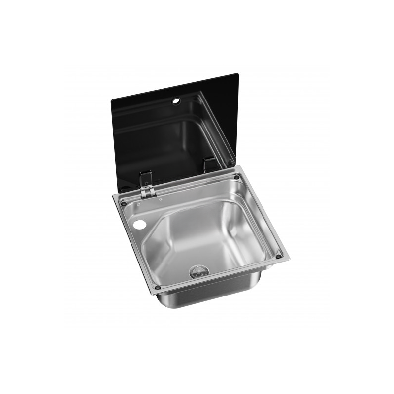 Seno+Tapa Dometic SNG6044 Combinación de fregadero y escurridor con tapa de vidrio. Compacto y práctico. Tapa de vidrio de seguridad resistente al calor. Resistente y fácil de limpiar. Con orificio para grifo de Ø 27 mm (no incluido). Cubo de basura integrado. Incluye sifón y junta de goma.