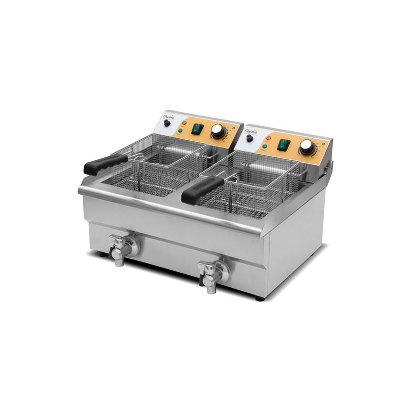 • Freidora eléctrica doble de 2 × 10 litros CHEF PRO, ideal para cocinas profesionales de restaurantes, hoteles y caterings que necesitan alto rendimiento y facilidad de limpieza. Potencia total de 6 kW (2 × 3 kW) y cuerpo de acero inoxidable.