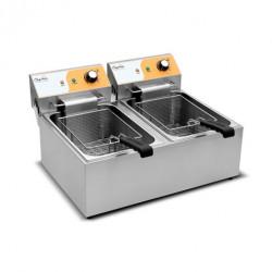 • Freidora eléctrica doble de 2 × 11 litros CHEF PRO, ideal para restaurantes, hoteles y negocios de hostelería con gran volumen de fritura. Equipada con dos cubas independientes de acero inoxidable y potencia total de 6 kW (2 × 3 kW).