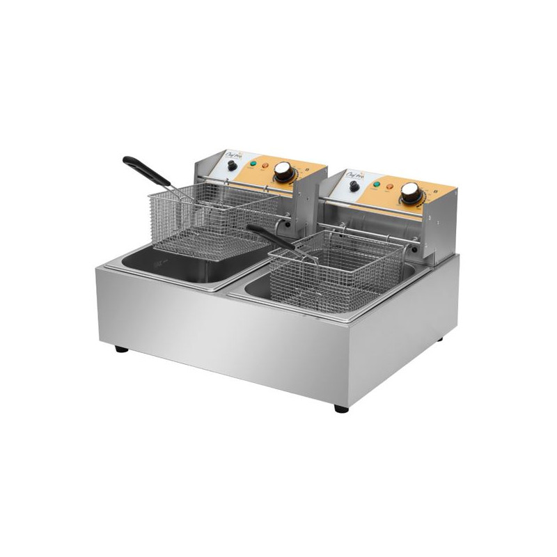 • Freidora eléctrica doble de 2 × 9 litros CHEF PRO, ideal para restaurantes, bares y negocios de hostelería con alto volumen de fritura. Equipada con dos cubas independientes de acero inoxidable y potencia total de 5 kW (2 × 2,5 kW).