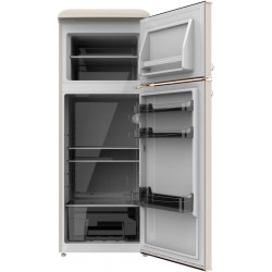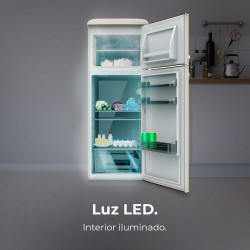 Frigorífico 2 puertas Retro Color BEIGE Medida alto/ancho/fondo 1440x550x615 mm Clasificación energética E Volumen total bruto 210 L Volumen refrigerador 162 L Volumen congelador 44 L Funcionamiento mecánico Luz LED en refrigerador 4 Bandejas de cristal con insertos metálicos 1 Cajón verdulero 3 Balcones en puertas con insertos metálicos 1 Bandeja en...