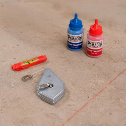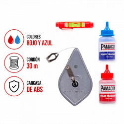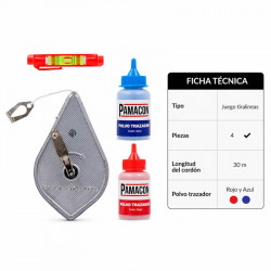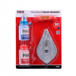 TIRALINEAS Y POLVO TRAZADOR 30 METROS PAMACON • Juego de tiralíneas y polvo trazador. • Muy útil como marcador de líneas en albañilería, construccíón y bricolaje. • Sistema rápido de retroceso del cordón. • Gancho de acero inoxidable. • Bidón de plástico con boca especial para recarga. • Incluye polvo trazador azul y polvo trazador rojo. • No se deshilacha.