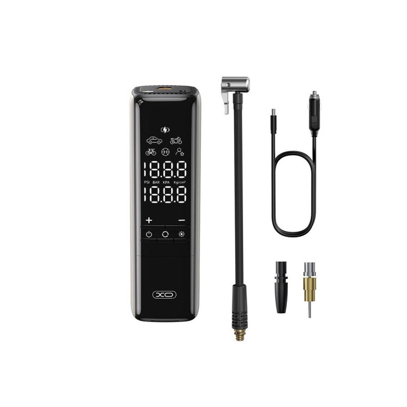 • Compresor de aire portátil 150 PSI. • Diseño portátil y compacto. • Ideal para inflar neumáticos, balones, colchonetas, o ruedas de bicicleta. • Cuatro modos de inflado. • Batería recargable de 2.000 mAh (x2). • Función Power Bank. • Linterna LED. • Puerto Type-C. • Incluye boquillas.