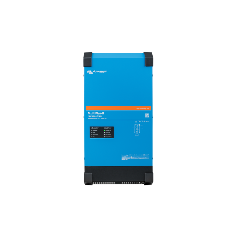 El Victron Energy MultiPlus-II 12/3000/120-32 es un inversor/cargador de onda senoidal pura para sistemas de 12V que combina 3000VA (≈2400W) de potencia continua, un cargador de 120A y un conmutador de transferencia de 32A en un solo equipo. Está preparado tanto para aplicaciones marinas, móviles y aisladas como para funcionar como parte de un sistema ESS (almacenamiento de energía conectado a red).