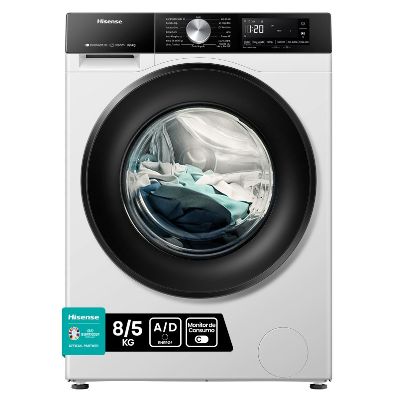 LAVADORA SECADORA - HISENNSE WD3S8043BW3, LAVADO 8 KG, SECADO 5 KG, 1400 RPM, CLASE A, MOTOR INVERTER, WIFI, BLANCO.