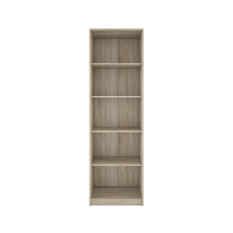 Estantería 58 cm modelo ARA, fabricada en melamina y patas de metal. Disponible en color roble/negro. Medidas: Largo 58 x Fondo 35 x Alto 175 cm.