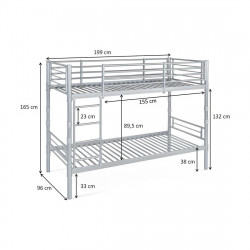 Litera metálica de 90x190 cm en la parte superior y de 135 cm en la parte inferior, con estructura de hierro, escalera y barandillas de protección.