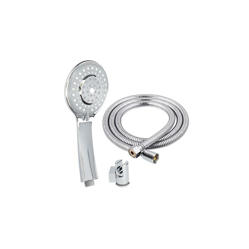 Mando de ducha y manguera en acabado cromo 1 Función. Indicador de temperatura: cambia el color segun temperatura. Manguera 1,5 mts. Medidas mango: 80x220mm. Incluye Soporte.