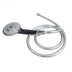 • Mango de ducha Serie Ginebra. • Manguera de 1.5 m. • Salida de agua 0.5 mm. • Diámetro 10.8 cm. • Acabado cromado.