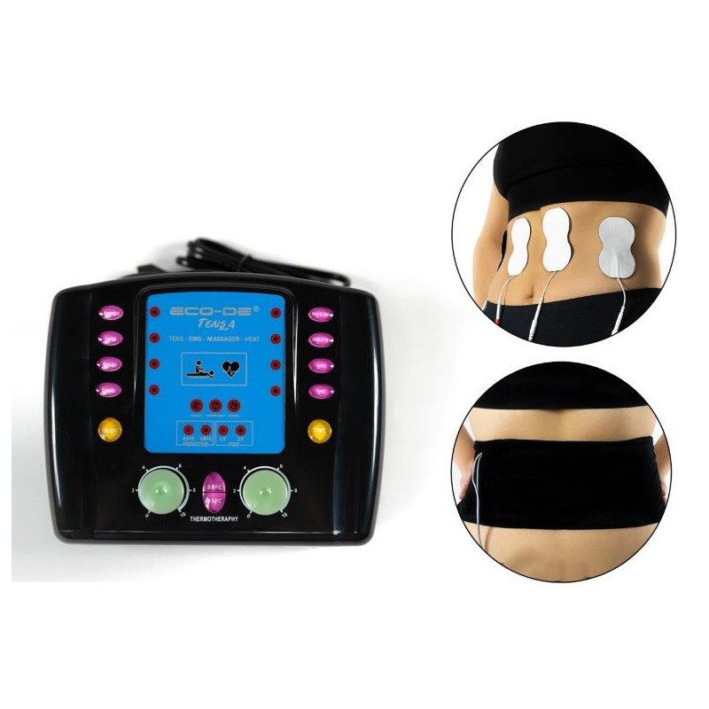Electroestimulador Digital TENS 4 Massager de doble canal. Dispone de las funciones de TENS, EMS, MASSAGER, que se utilizarán mediante sus 4 electrodos repartidos en 2 canales. La función de termoterápia se utilizará mediante su cinturón ajustable para cintura, piernas o brazos. La temperatura puede ajustarse a 45º o 58º. Los electroestimuladores ECO-DE, están basados en la electropuntura, tienen la capacidad de actuar como calmantes electrónicos del dolor, sin producir ningún tipo de efectos secundarios.