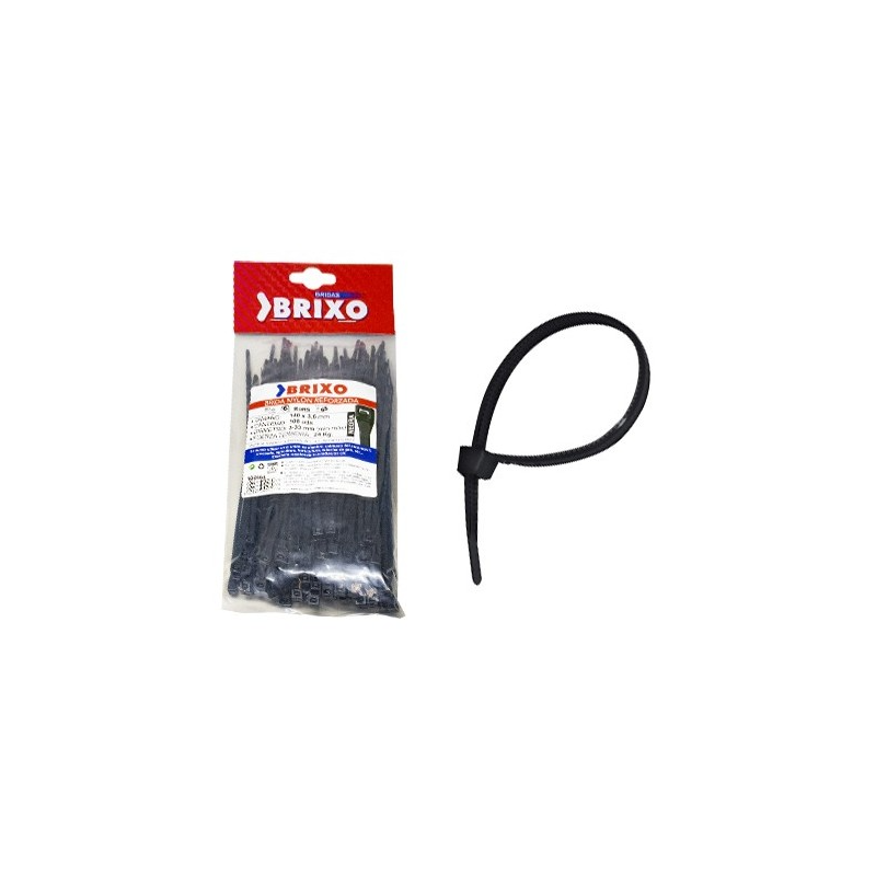 Bridas plásticas fabricadas con poliamida 6.6 - Color: Negro - Grosor: 3,6 Milimetros - Largo: 140 Milimetros - Diámetro de apertura: 2-22 Milimetros - Tensión soportada: 11kg Marca BRIXO