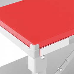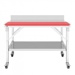 • Perfecta para cocinas de restaurantes, hoteles, buffet, pastelería, etc. • Placa de corte color rojo. • Plegable. • Superficie de trabajo sin zócalo. • Estante inferior. • Ruedas giratorias con frenos. • Medidas: 120x60x80 cm.