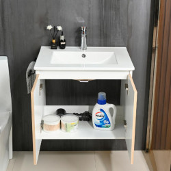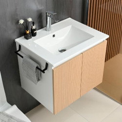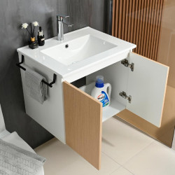• Mueble de baño suspendido color roble. • Combinación perfecta de modernidad y funcionalidad. • Gran espacio para el almacenaje gracias a sus dos cajones con cierre suave. • Cajones sin tiradores, diseño urbano. • Incluye lavabo cerámico. • Fácil de limpiar. • Grifería, espejo y columna no incluidos.