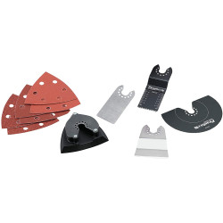 Inlcuye: 1 x adaptador para accesorios Bosch, Einhell y Worx, 1 x rascador flexible, 1 x rascador rígido, 1 x multi-herramienta oscilante 300W, 6 x hojas de lija (Granos 60, 80 y 120), 1 x hoja de sierra de incisión para madera y metal, 1 x hoja de sierra para cortes a ras de superficie y 1 x plato para lijar con extracción de polvo