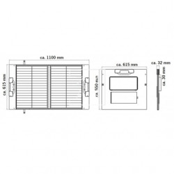 Dimensiones: 700 x 955 x 2,5 mm (largo x ancho x grosor mm). Corriente en cortocircuito: 6,14 Amperios (120W). Pmax: 110 W. Vmp: 18,00 V. Imp: 6,14 A. Voc: 21,12 V. Isc: 6,67 A. T.C.: AM1.5, 1000W/ M2, 25ºC. Tipo de célula: Monocristalino. Peso aproximado: 2,5 kg.