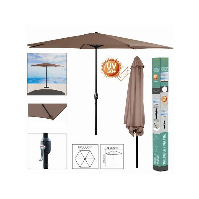•Color beige •Diametro 300cm •Altura: 245cm •180gr/m2 UV50 •Mecanismo de manivela •Base regulable