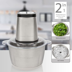 Triturado en segundos: Wenn es mal bei der Essenszubereitung muss oder man es einfach aus Bequemlichkeit eher schnell und gefahrlos kleinschneiden will. Con la trituradora multitrituradora PC-MZ 1227 2 en 1 de ProfiCook obtienes el dispositivo ideal para cortar rápidamente varios ingredientes. El recipiente de mezcla XL de acero inoxidable tiene capacidad para aprox. 1,7 litros, es resistente a los golpes y apto para lavavajillas. 2 niveles de velocidad garantizan el procesamiento perfecto de los ingredientes individuales: ingredientes duros, como el hielo se tritura con el nivel fuerte, ingredientes más suaves con el más ligero.