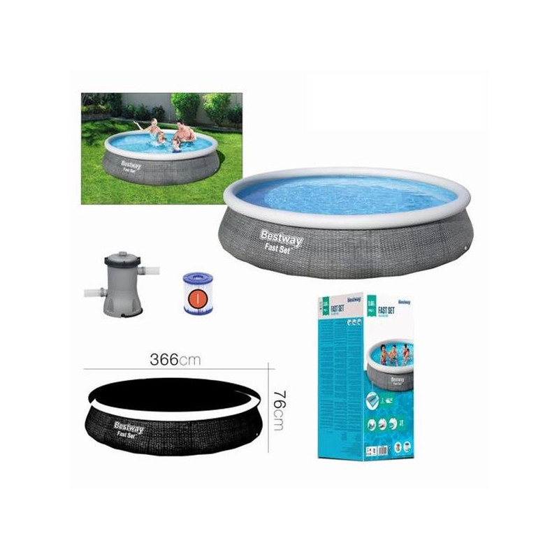La piscina Fast Set ™ Ø366x76 cm de Bestway es una opción perfecta para toda la familia. Se instala en unos pocos minutos sobre una superficie plana, quedando sólo el anillo superior inflado.