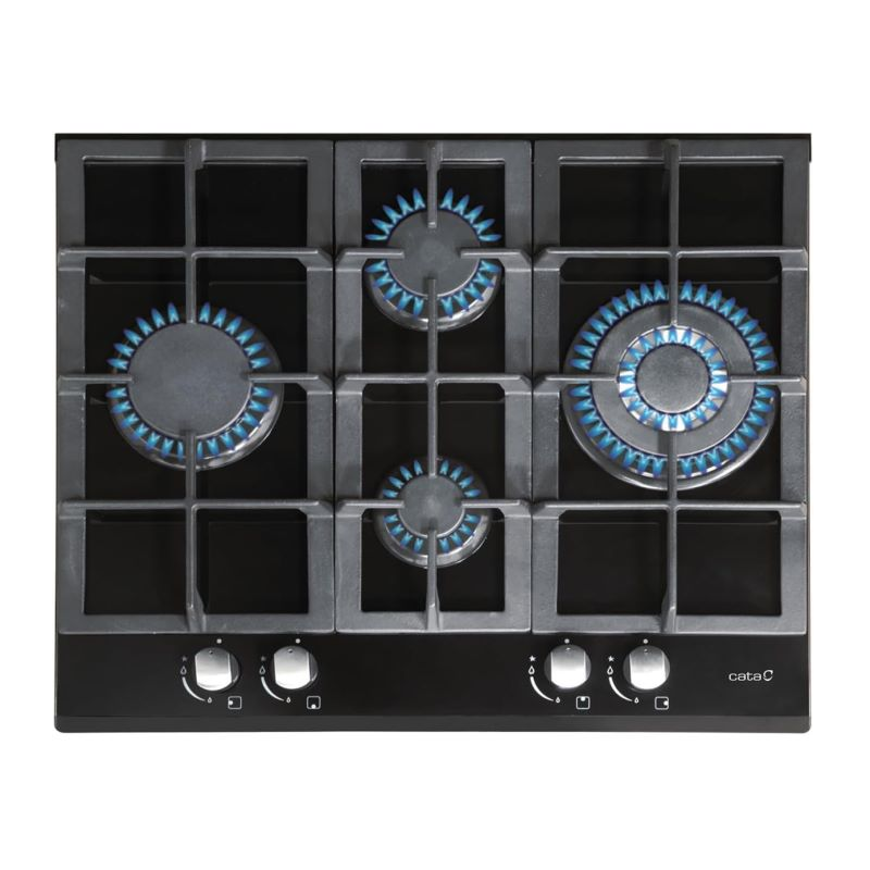 Placa Cristal Gas de 60 cm con mandos frontales ergonómicos de gas butano. Mandos frontales de diseño ergonómico. Ancho (mm):600 Color:Negro Fondo (mm):510 Independiente:Sí Nº de zonas:3 Tipo:Gas Tipo de gas:Butano