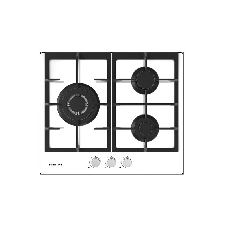 PLACA CRISTAL DE GAS - INFINITON GG-332, 3 FUEGOS, HOBS NEGRO, BLANCO INTEGRADO 60 CM