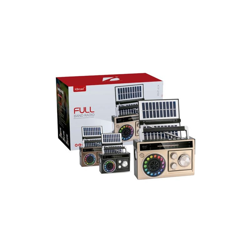 • Sintonizador de radio: Soporta bandas FM, AM y SW (onda corta). • Fuentes de energía: • Panel solar integrado en la parte superior para carga autónoma. • Batería recargable interna. • Compartimento para pilas tradicionales (opcional). • Entrada de carga de corriente continua (DC 5V). • Conectividad y reproducción: • Puerto USB para pendrives. • Ranura...